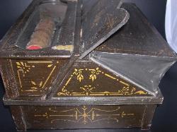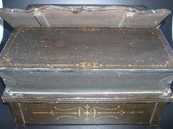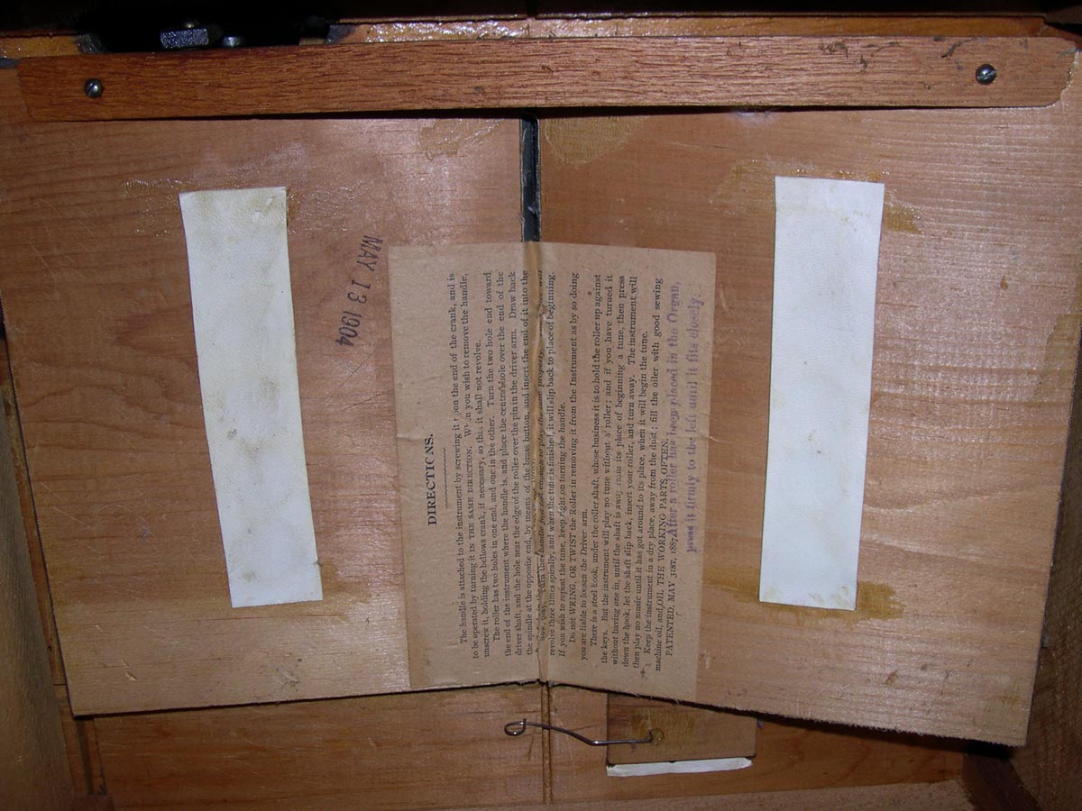| This 'Home Music Box' Roller Organ was made in 1904 (date stamped on bottom of bellows). It is in excellent operating condition and all original paint and stencils. Minor wear consistent with age. |