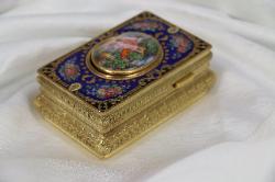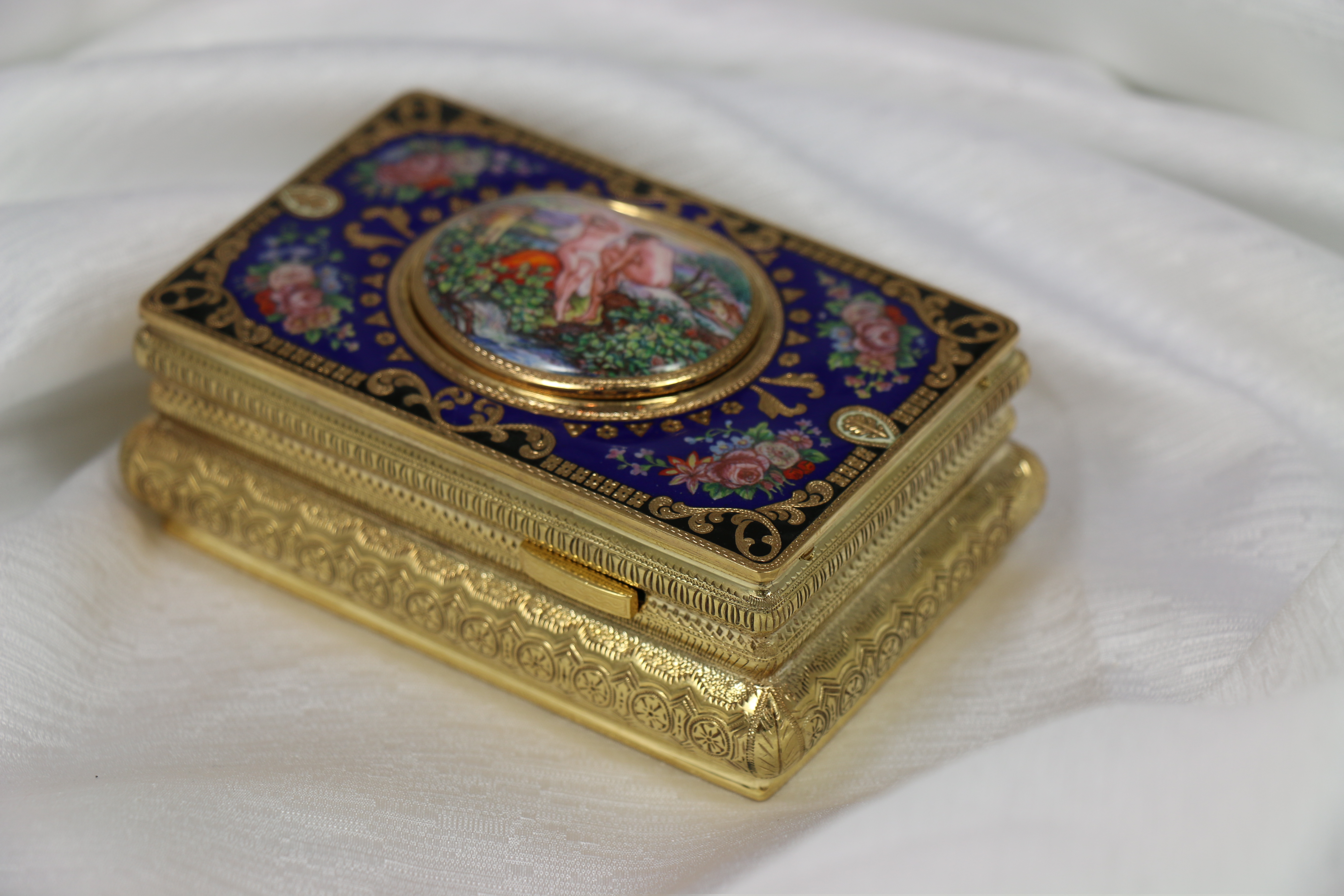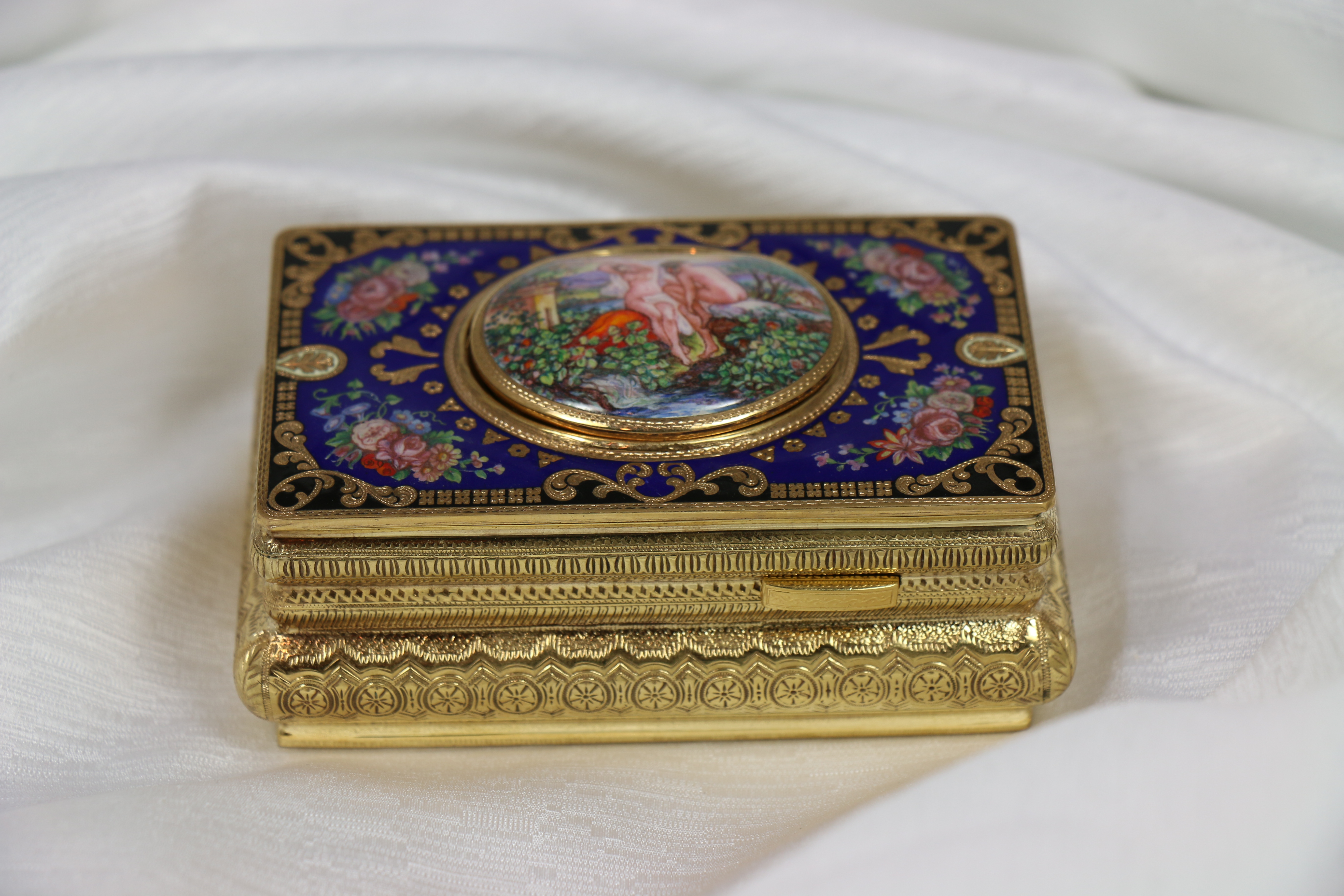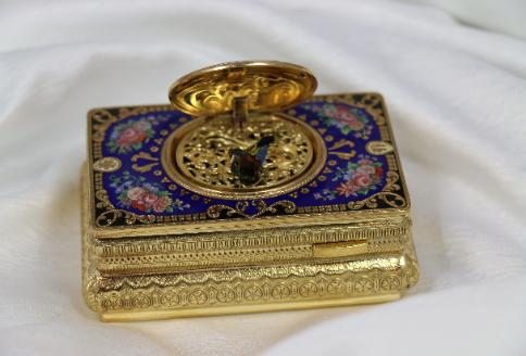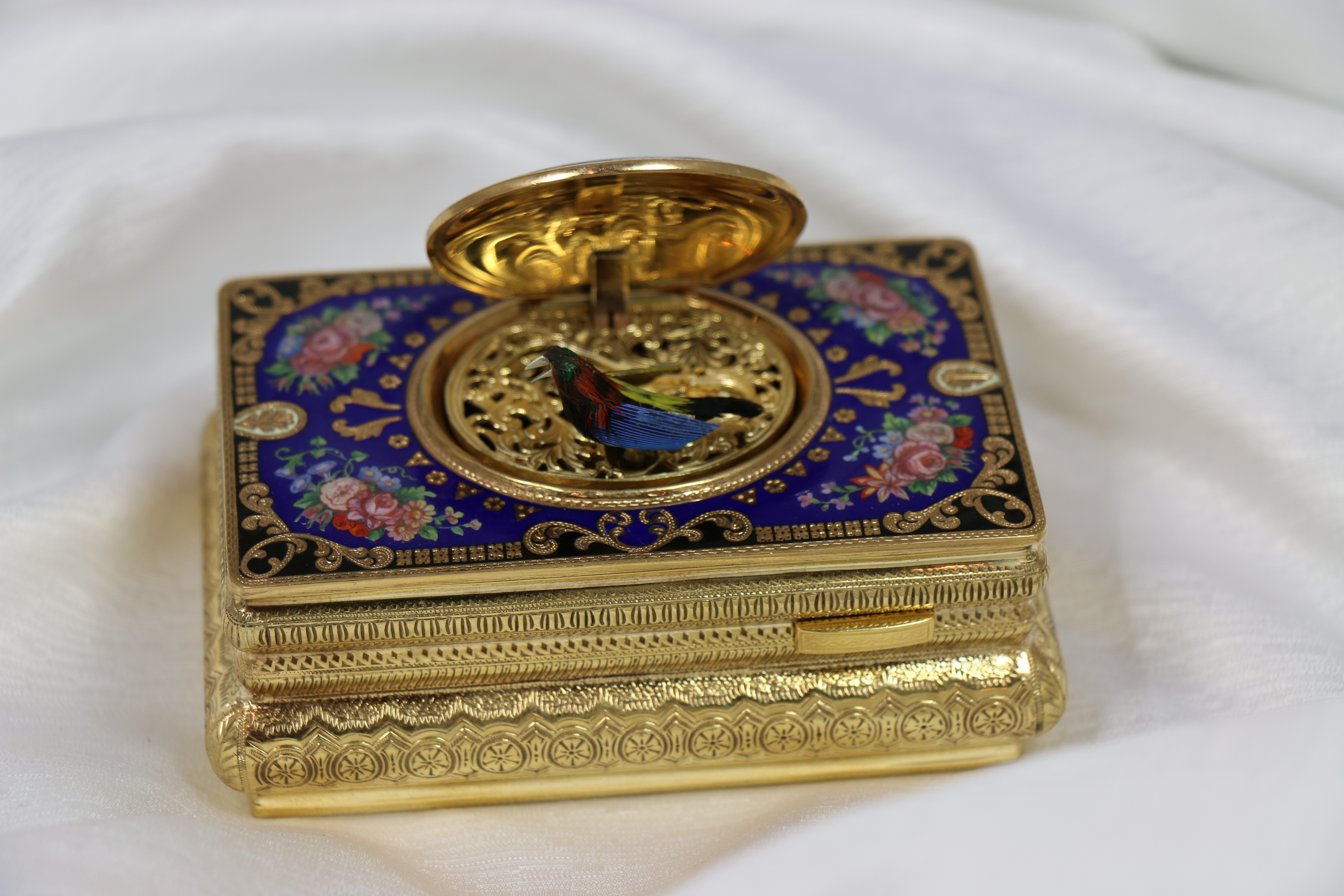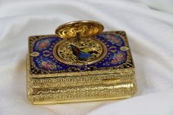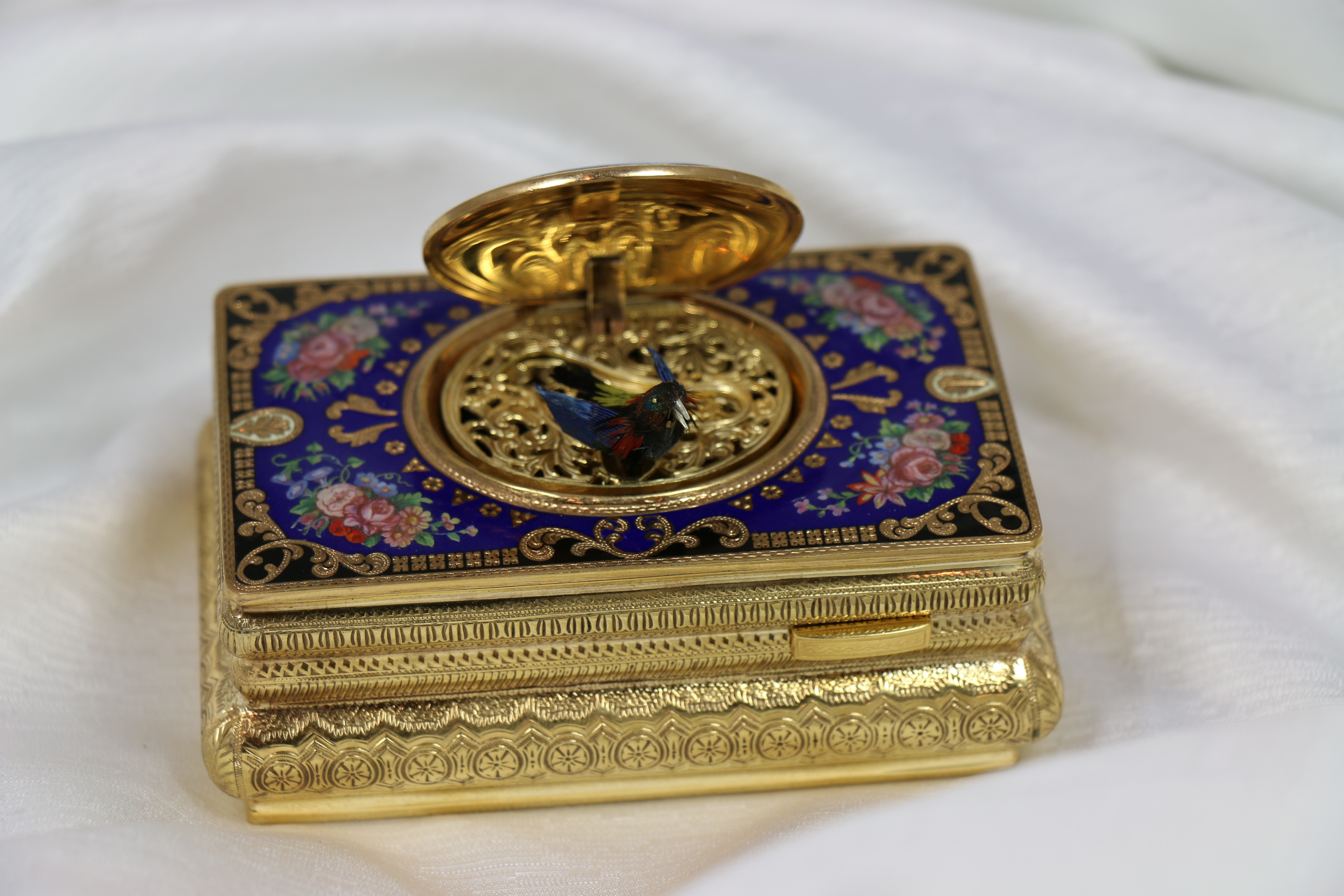 | Movement and Case by German artisans. Produced the same way for nearly a century. Gold-plated sterling silver metal work with dark blue enamel and hand-painted details. This particular design is derived from an antique Swiss design and still is sold by some dealers as "Swiss". You will find this box sold as an an antique and we have antiques that appear identical on other pages. Please be careful to check the background and provenance of all bird boxes for authenticity. This particular bird box automaton is NEW with full warranty. It will last for generations. One of our favorite designs. Timeless... |