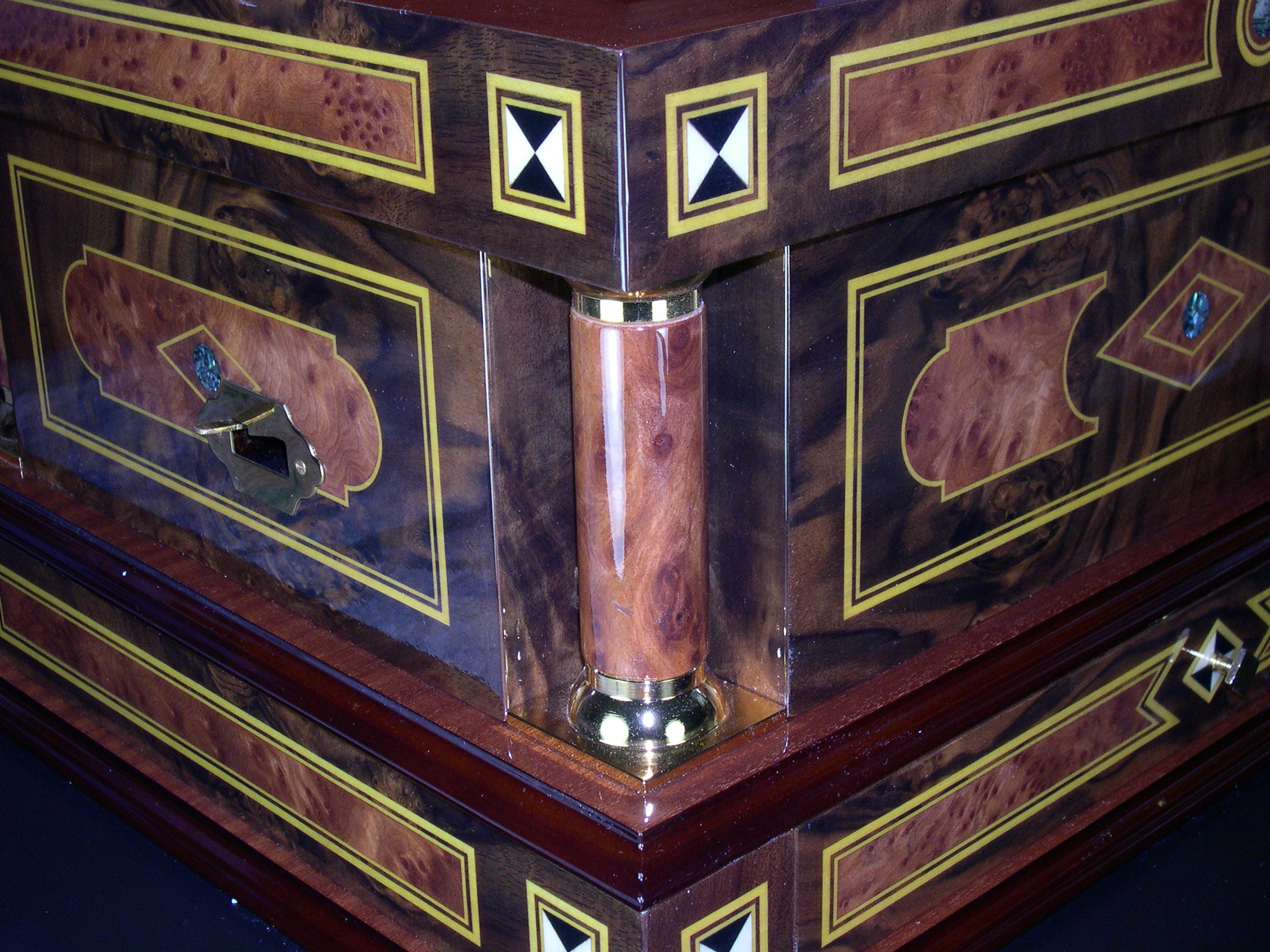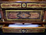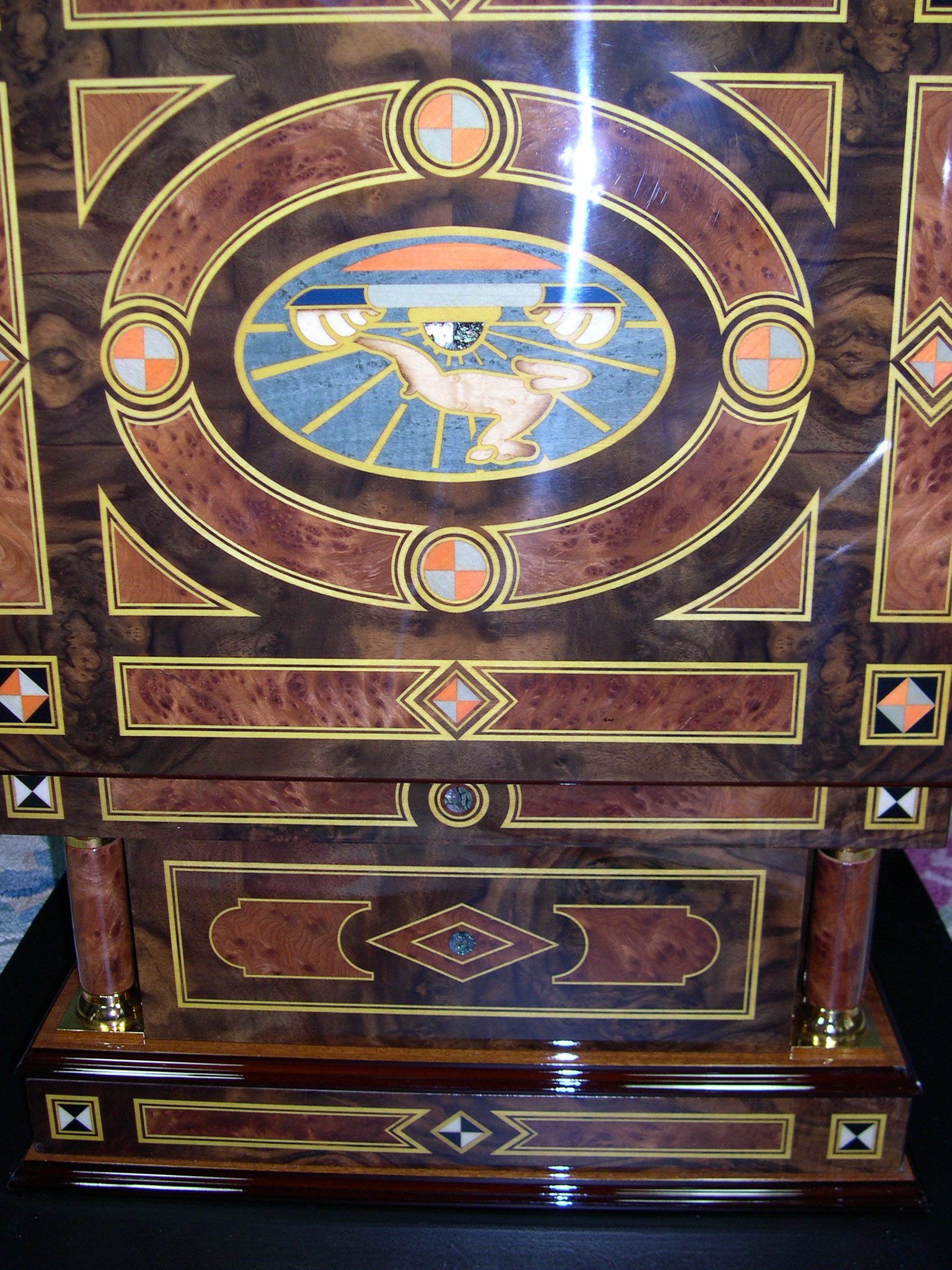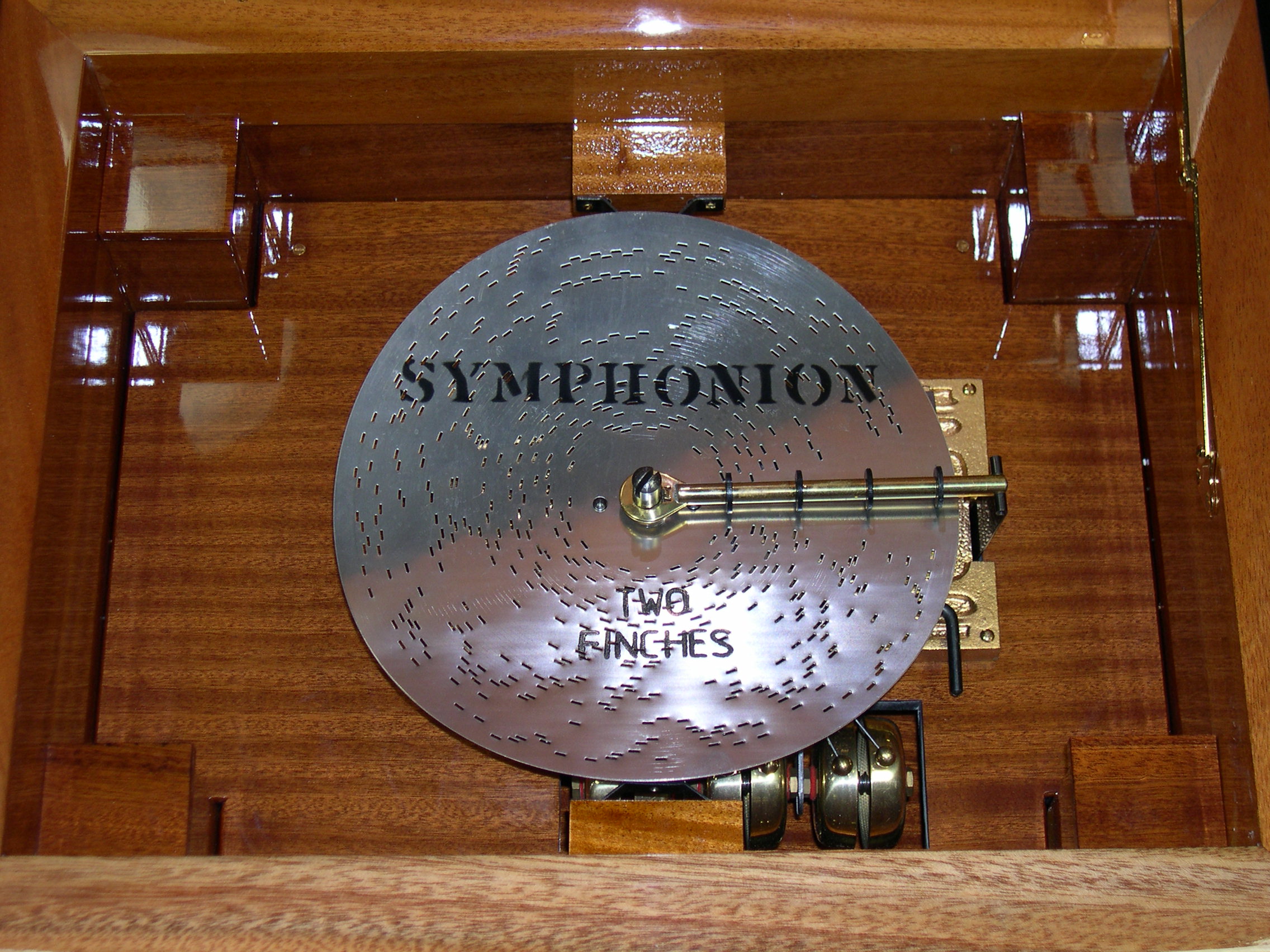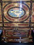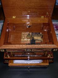 | 9- 1/2" (24cm) disc music box movement with 6 bells. The inlay 1/2" (24cm) disc music box movement with 6 bells. The inlay prized This is a wonderful reproduction of the late 19th century Kalliope 9 This is a wonderful reproduction of the late 19th century Kalliope 9 1/2" (24cm) disc music box movement with 6 bells. The inlay 1/2" (24cm) disc music box movement with 6 bells. The inlay prized vavona and California Walnut veneer. The case is cabinetry by Le Ore of Italy is remarkable in quality and finish in 20x16x12inches. The movement is brand new by MMM of Germany and hand wound with full rich sound and well-integrated bells. This instant heirloom is as beautiful of a case as we have ever seen on a disc musc box. Only a handful of these have been made, we have 1 in stock. Comes with 3 discs, though dozens more are available for purchase. |