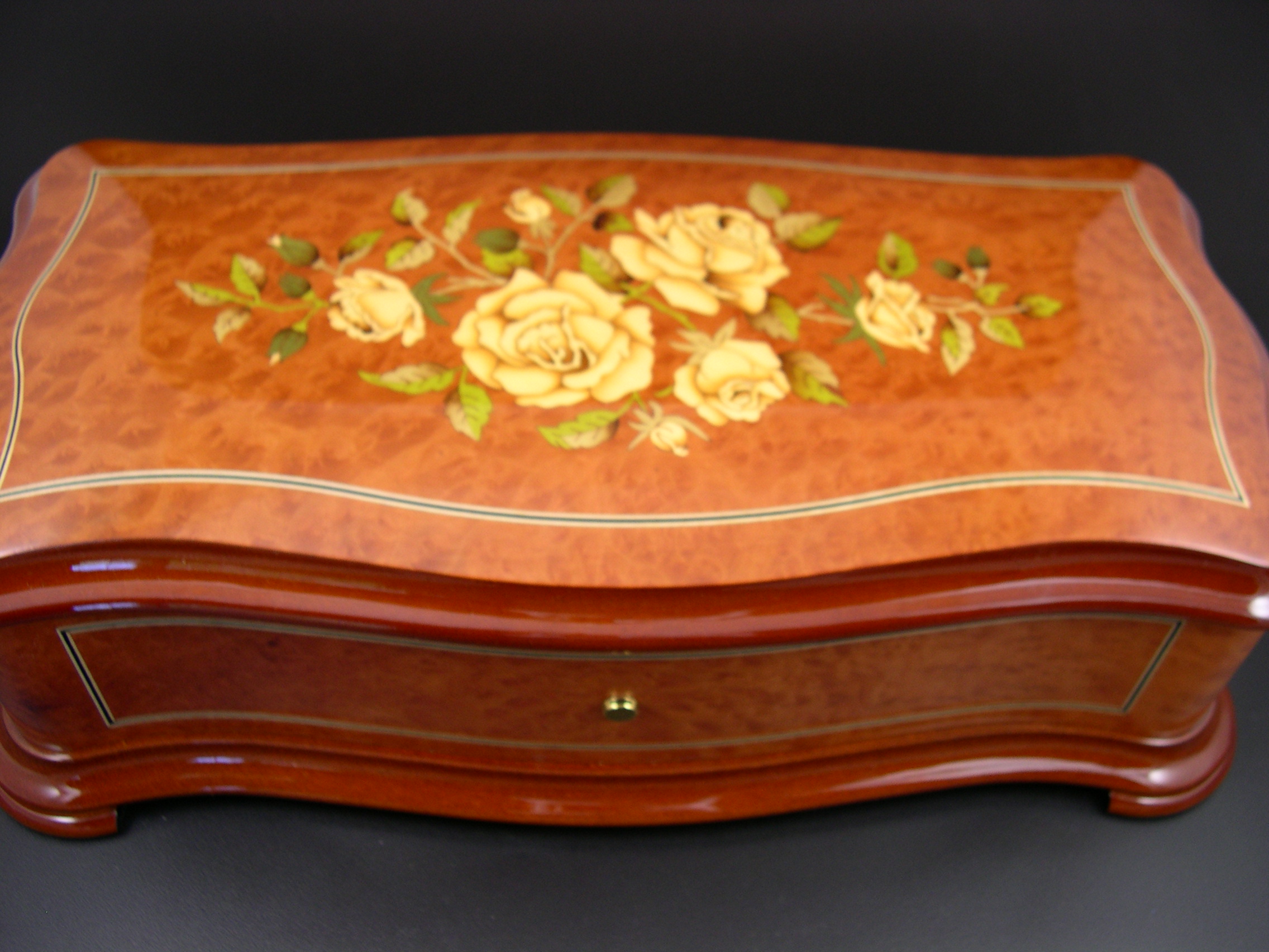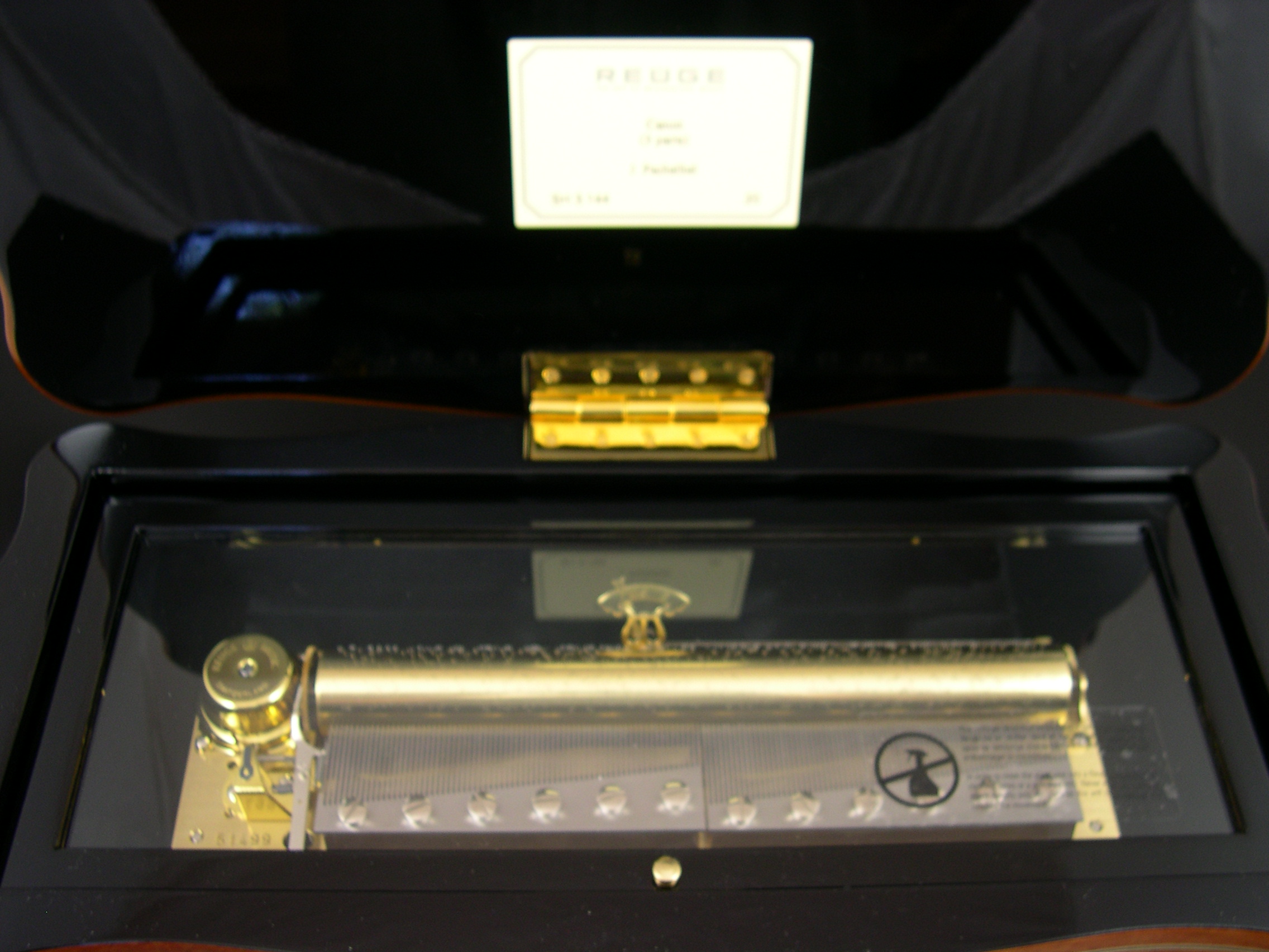 | This new Reuge cylinder music box is the top of the line in traditional dyed white maple. The movement is a twin comb, 144 note sublime harmony arrangement. The tune sheet shows three movements of Pachelbel's Canon which are wonderfully arranged. As with all new items this comes with a 1 year manufacturers warrantee and will be played for generations by family members. A delightful way to remember the past as we move into the digital age. Video below, please contact us for additional photos and details. |